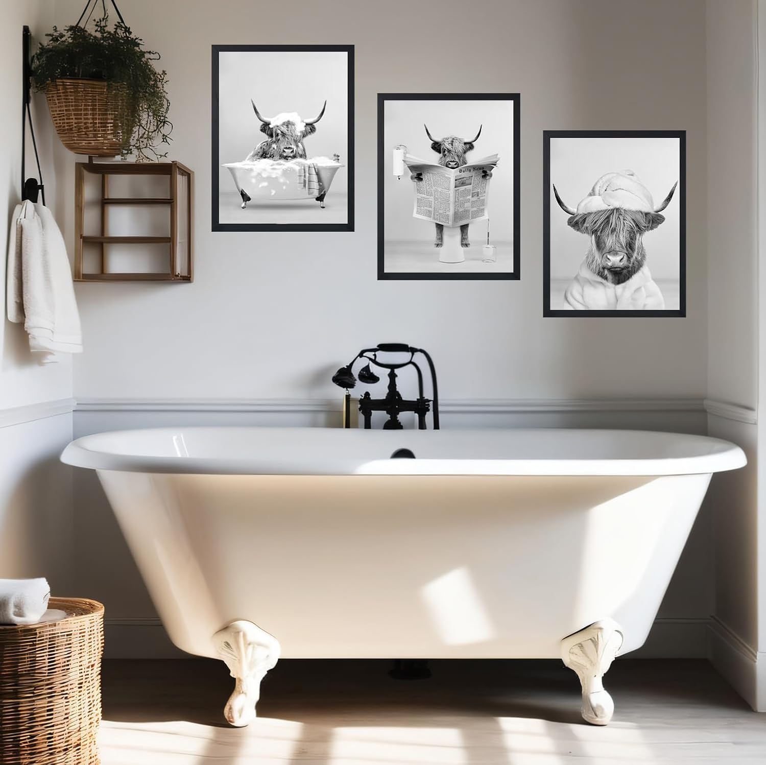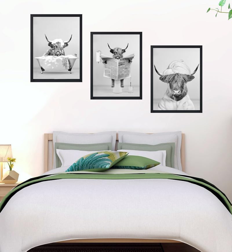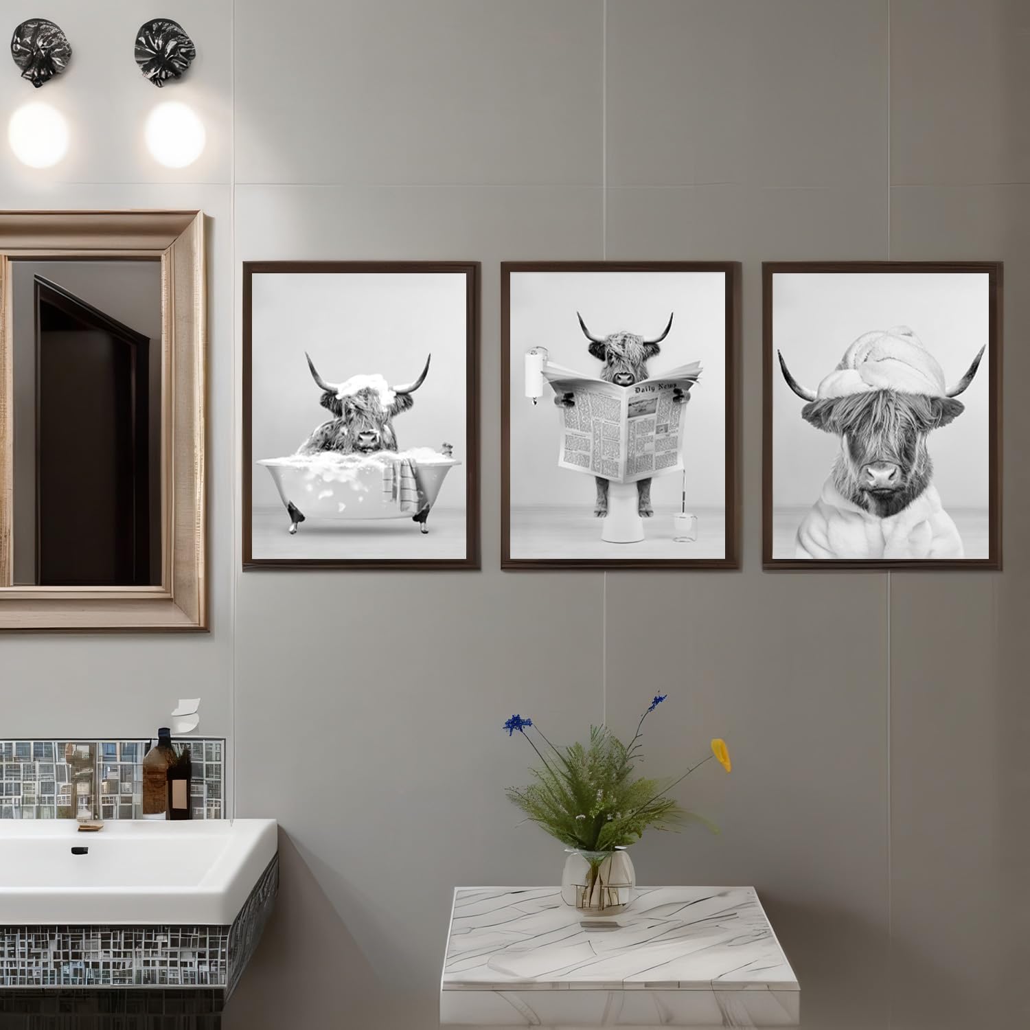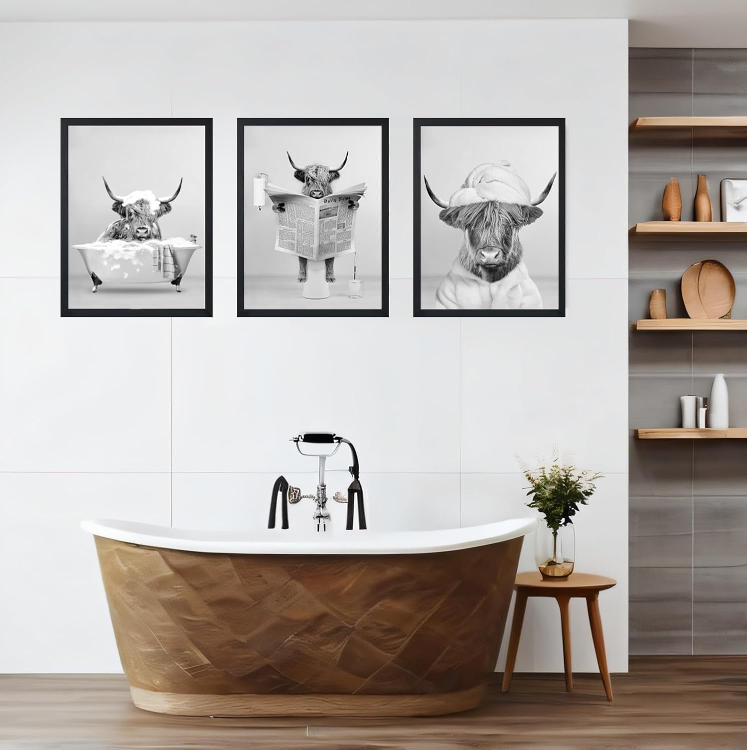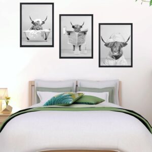 3pcs Funny Black and White Highland Cow Wall Art Bathroom Decor Stylish Canva Poster Printing Canvas Artwork for Living Room Apartment Bedroom Bathroom Office Hotel Wall Decor(16x24in unframed)