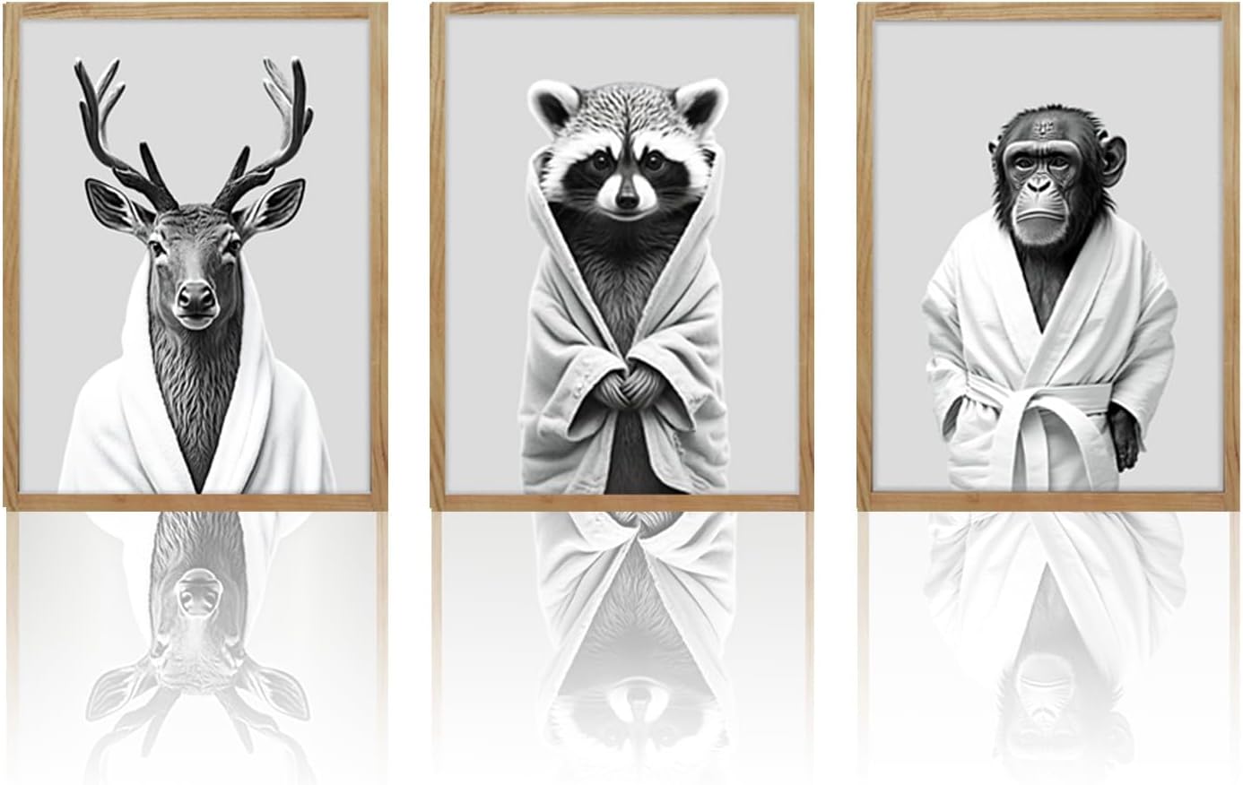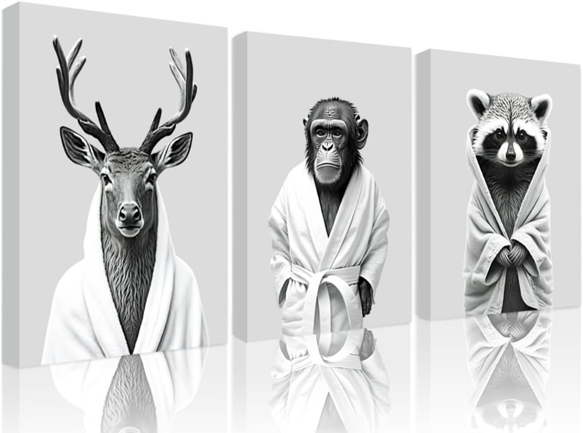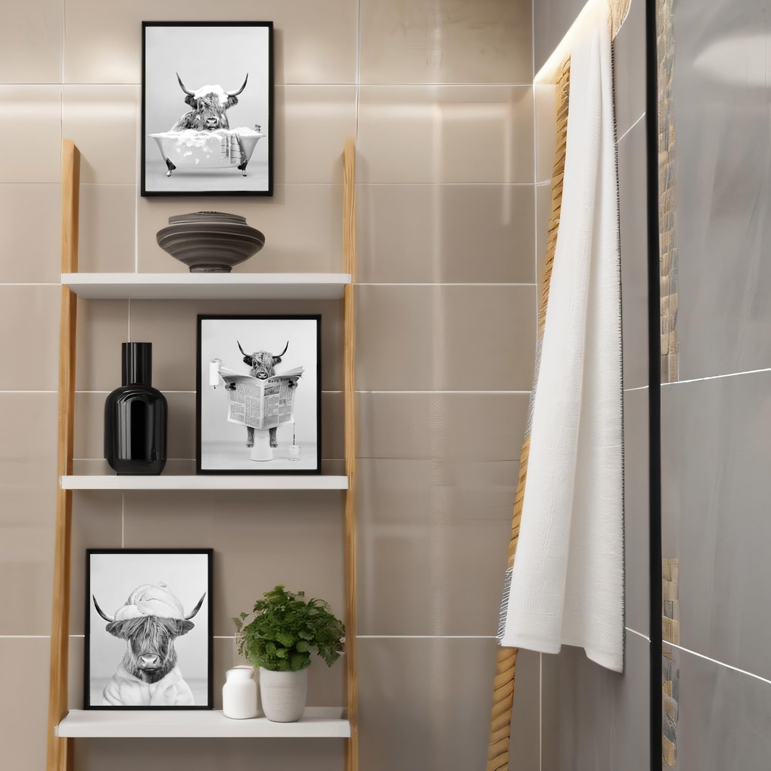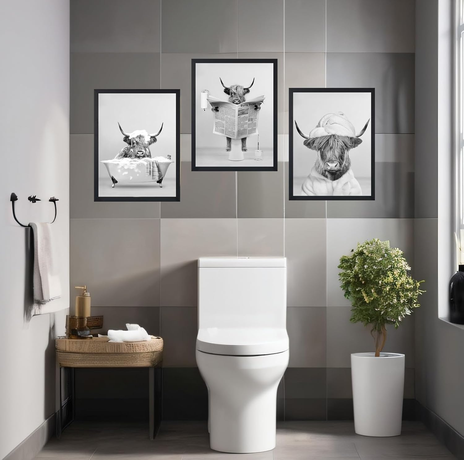 3pcs Funny Black and White Highland Cow Wall Art Bathroom Decor Stylish Canva Poster Printing Canvas Artwork for Living Room Apartment Bedroom Bathroom Office Hotel Wall Decor(16x24in unframed)