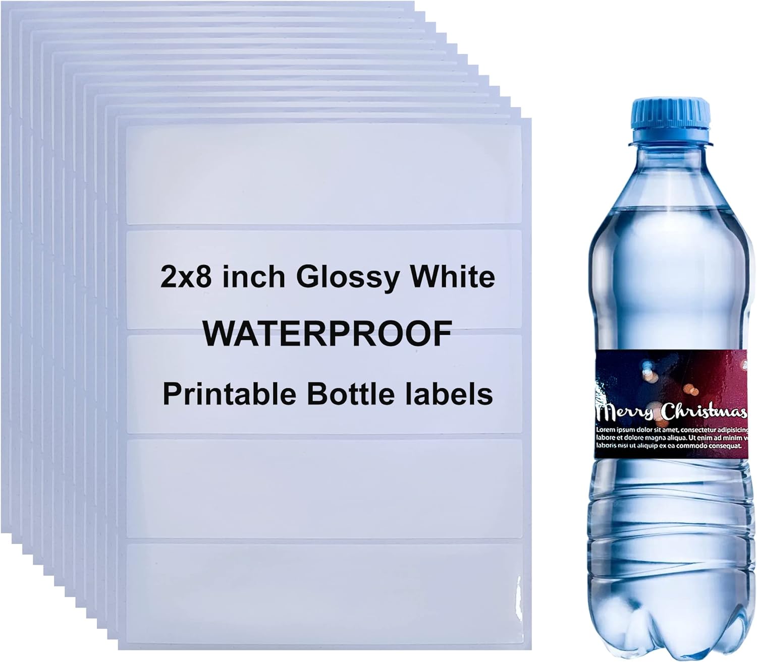 - 75 Labels 2"×8" Printable Glossy White Water Bottle Labels, Waterproof Vinyl Stickers Blank Wraparound Rectangle Sheet for Inkjet/Laser Printer
