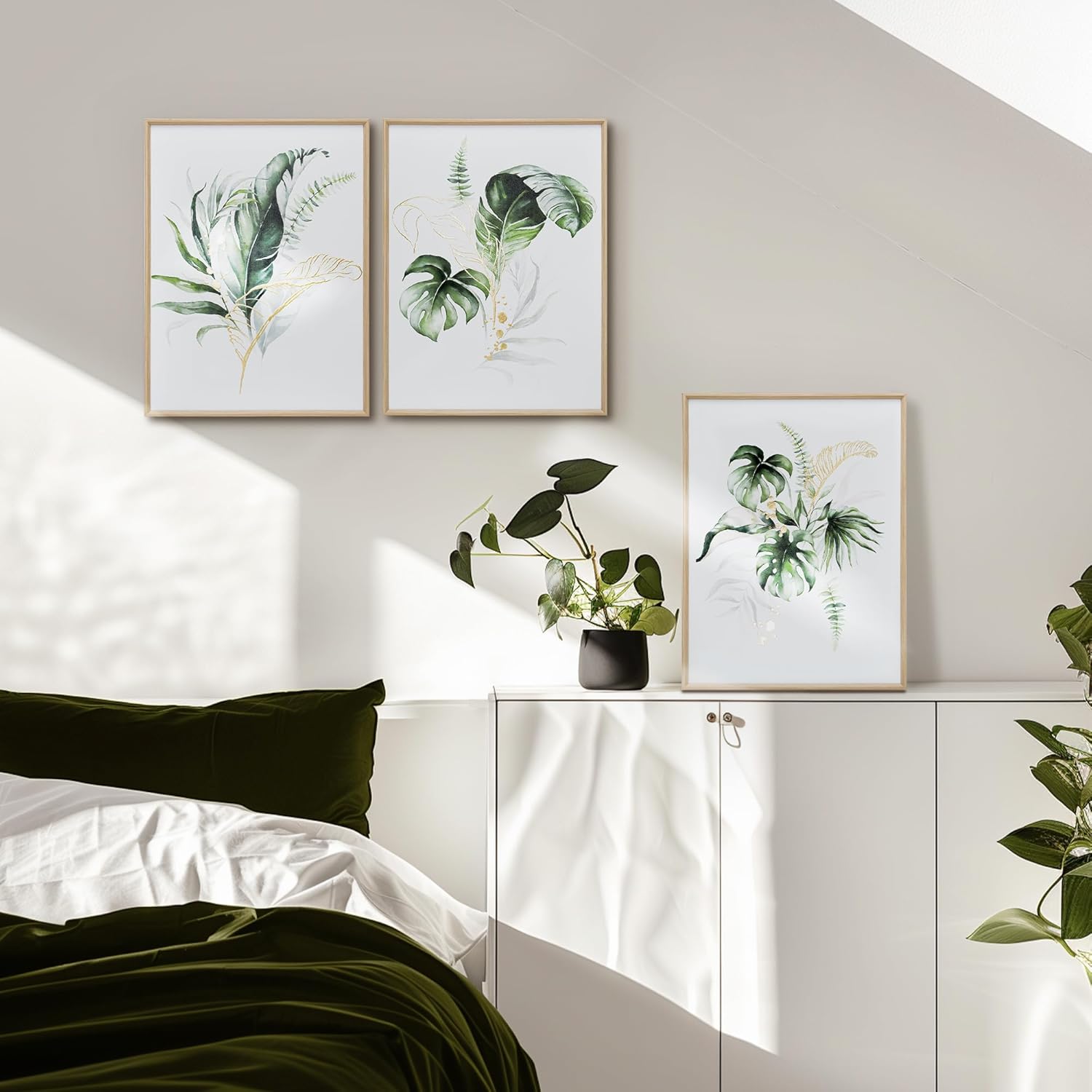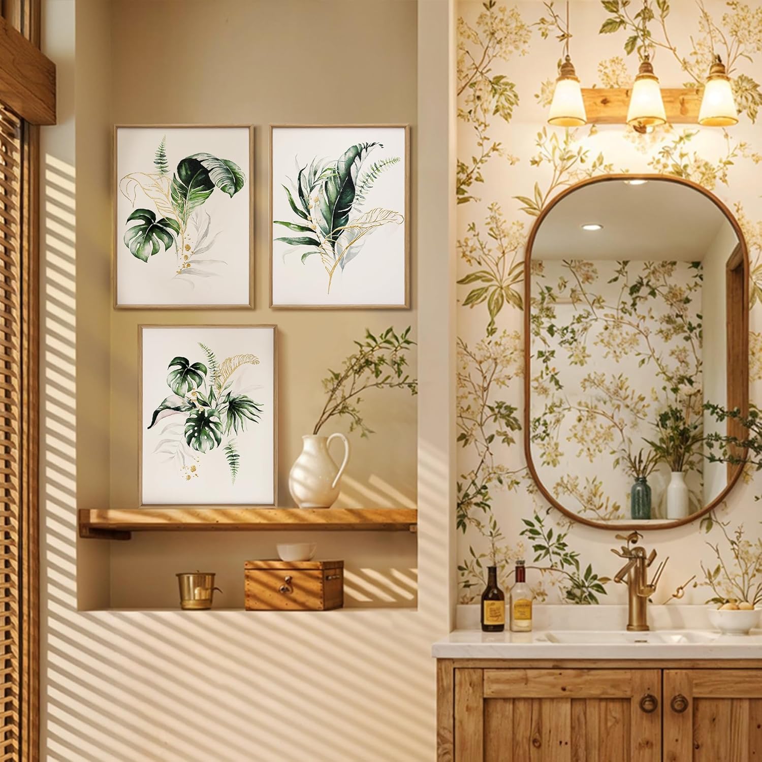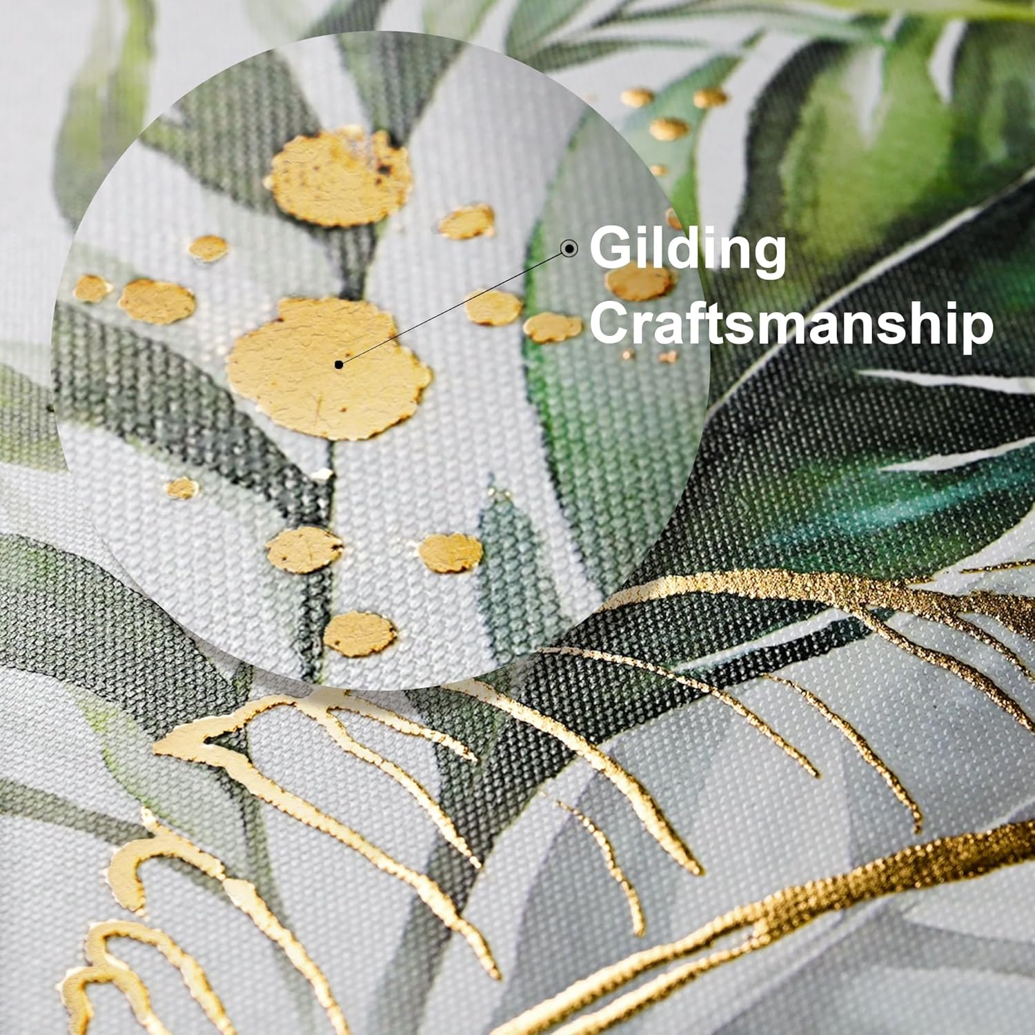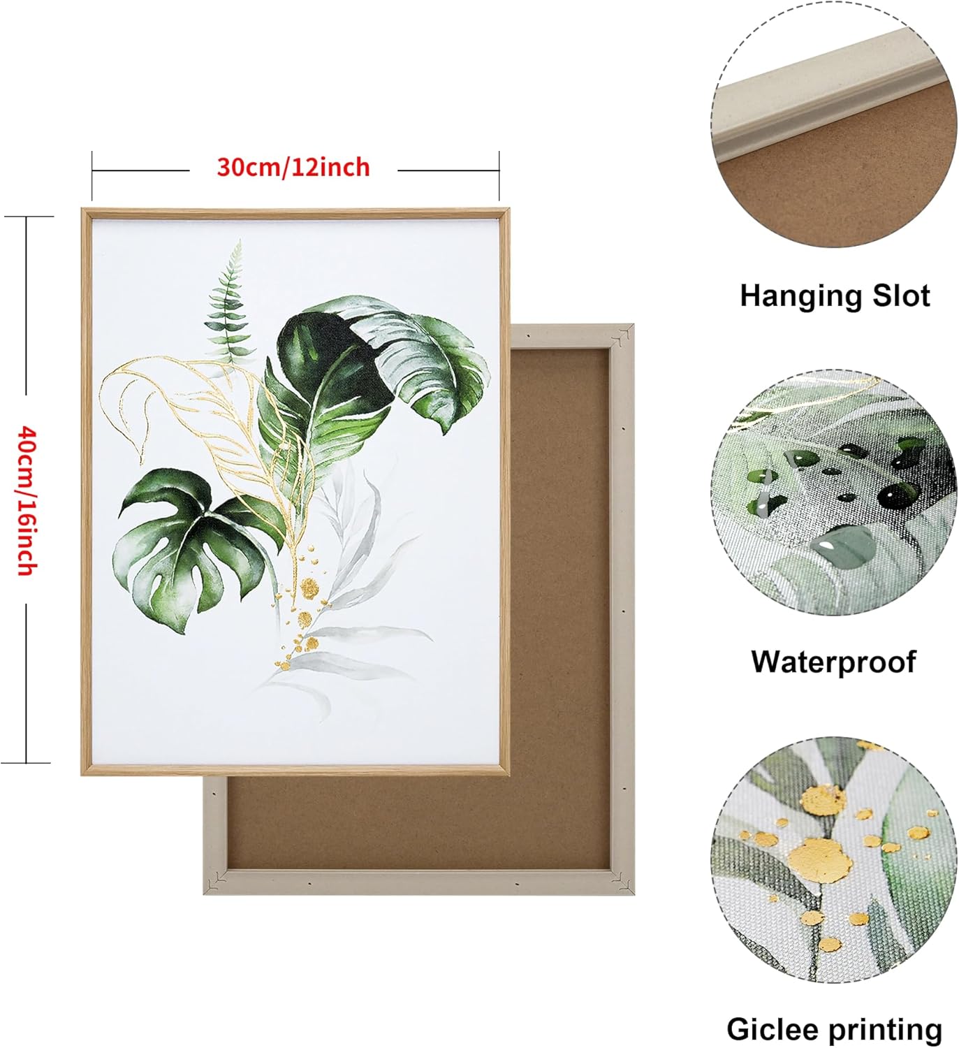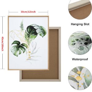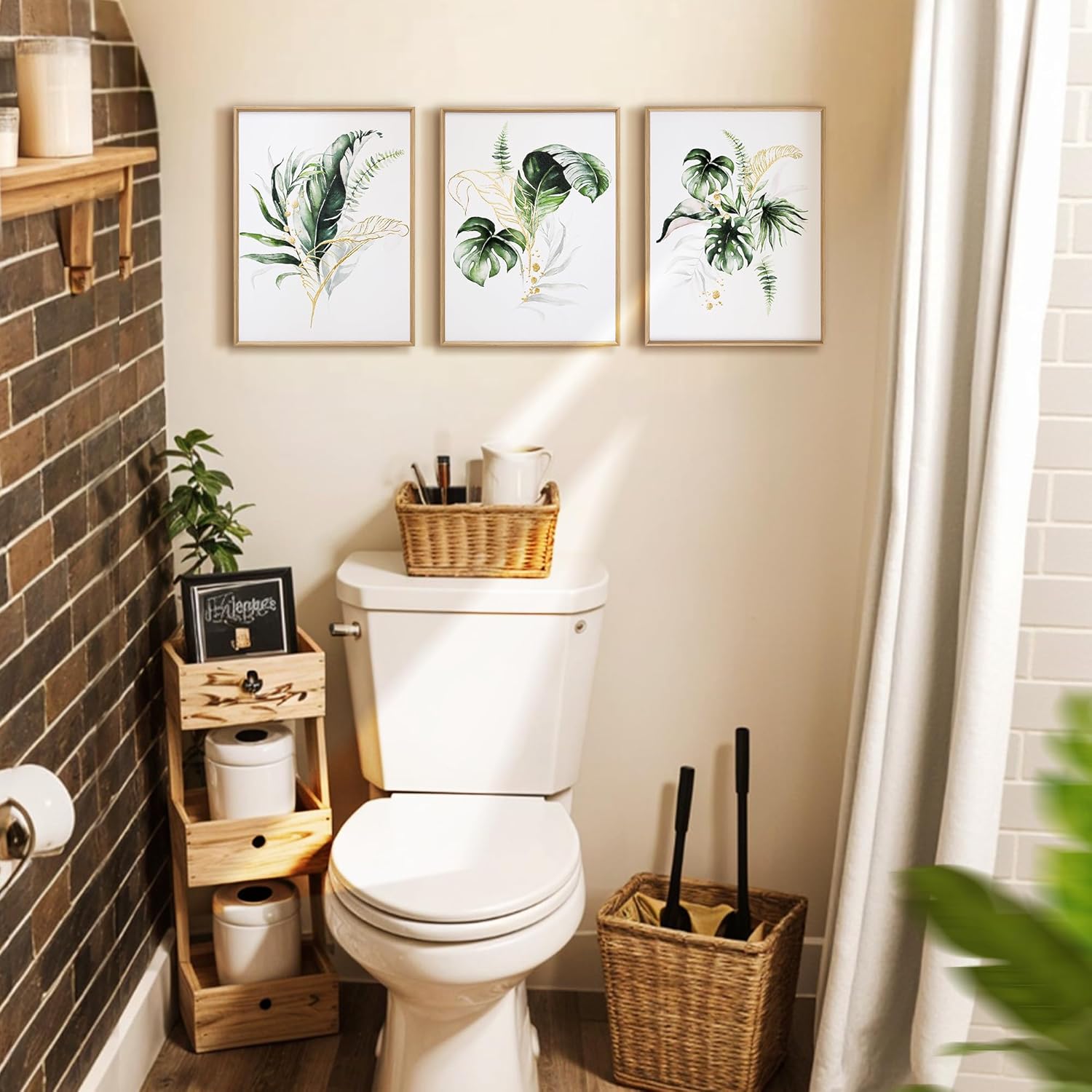 ArtbyHannah Bathroom Framed Wall Art, Botanical Canvas Paintings Wall Decor with Green and Gold Glided Textured Modern Nature Pictures Plant Prints for Living Room Bedroom (12×16 Inch, Set of 3)