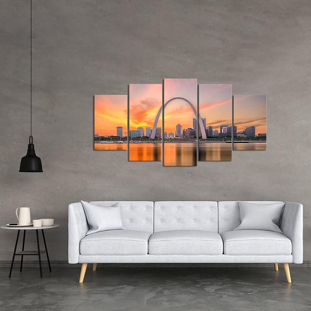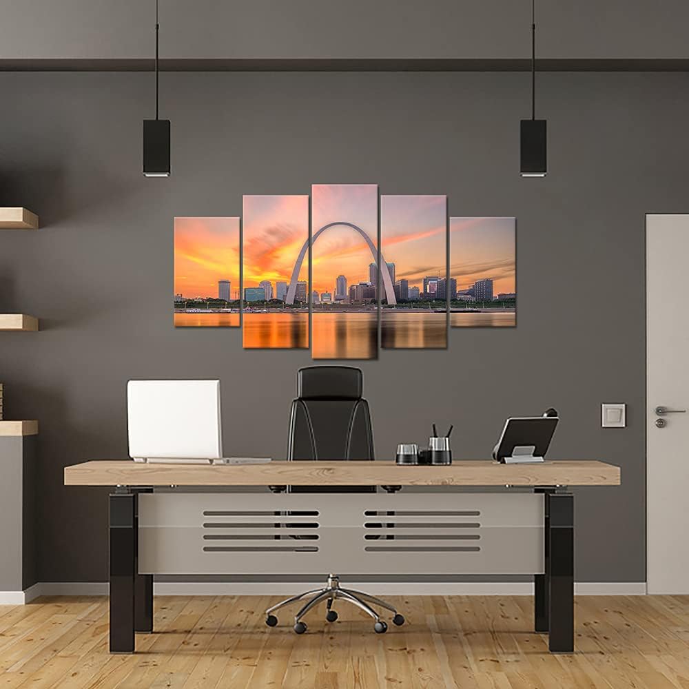 Canvbay 5 Piece City Skyline Canvas Wall Art St. Louis Gateway Arch at Sunset Painting Pictures USA Missouri Cityscape at Dusk Giclee Print Artwork for Living Room Home Decor Framed Ready to Hang