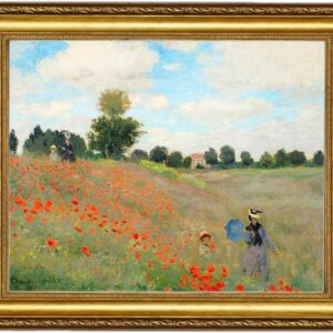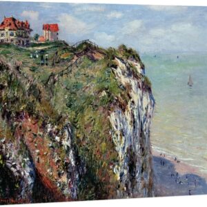 Monet spent the summer of 1867 at the resort town of Sainte-Adresse on the English Channel, near Le Havre (France). It was there, in a garden with a view of Honfleur on the horizon, that he painted this picture, which combines smooth, traditionally rendered areas with sparkling passages of rapid, separate brushwork, and spots of pure colour. It was there that he painted this buoyant, sunlit scene of contemporary leisure, enlisting his father (shown seated in a panama hat) and other relatives as models. By adopting an elevated viewpoint and painting the terrace, sea, and sky as three distinct bands of high-keyed color, Monet emphasized the flat surface of the canvas