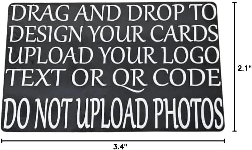 PLEASE DO NOT SEND PHOTOS, I CAN’T TRACE THEM TO ENGRAVE THEM. 1. Upload your logos or text only 2. Drag and drop your information right here in the listing to design your card 3. If you need design or logo ideas look at Canva.com, its free and easy to use 4. Select from 20, 50 or 100 custom metal cards 5. DO NOT SEND PHOTOS, I cant trace or engrave photos. Please send line art, logos, QR codes or text. 6. Each card is made of thin metal – making them strong but also flexible. Size: 3.4 x 2.1 inch, (0.2mm thickness). Edges are clean and not sharp with rounded corners. 7. If your not sure how to design your card. Just provide your information and I will design it for you.