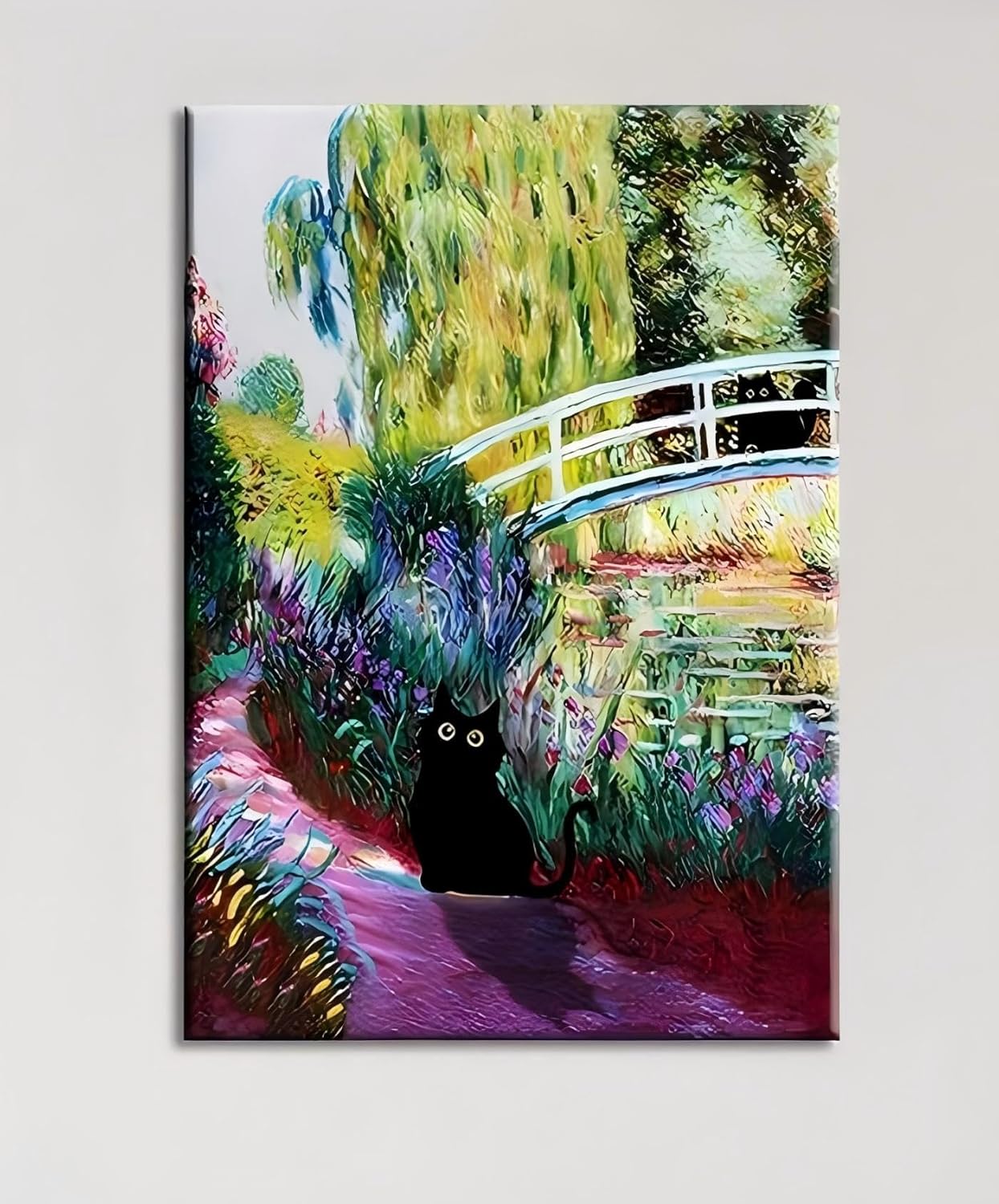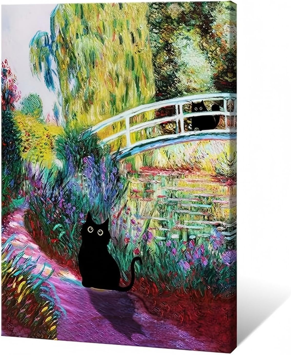 Gwindrise Black Cat Wall Art Painting, Black Cat Garden Bridge Canvas Wall Art, 12×16 inches, Framed, Ready to Hang, Waterproof Print