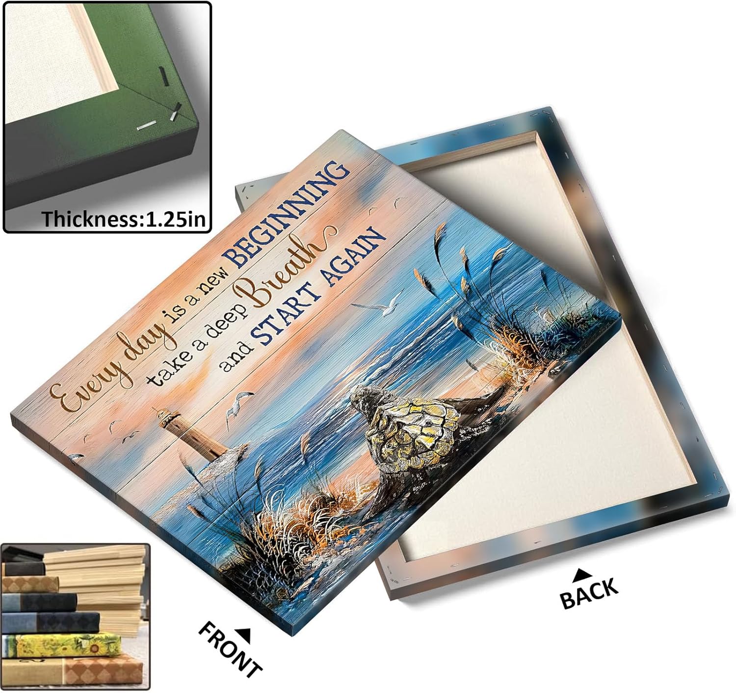 Inspirational Canvas Wall Art, “Every Day is a New Beginning” Motivational Quote Print, Seaside View with Turtle and Lighthouse, Framed Picture Print Wall Art for Living Room and Office 16″ x 20″