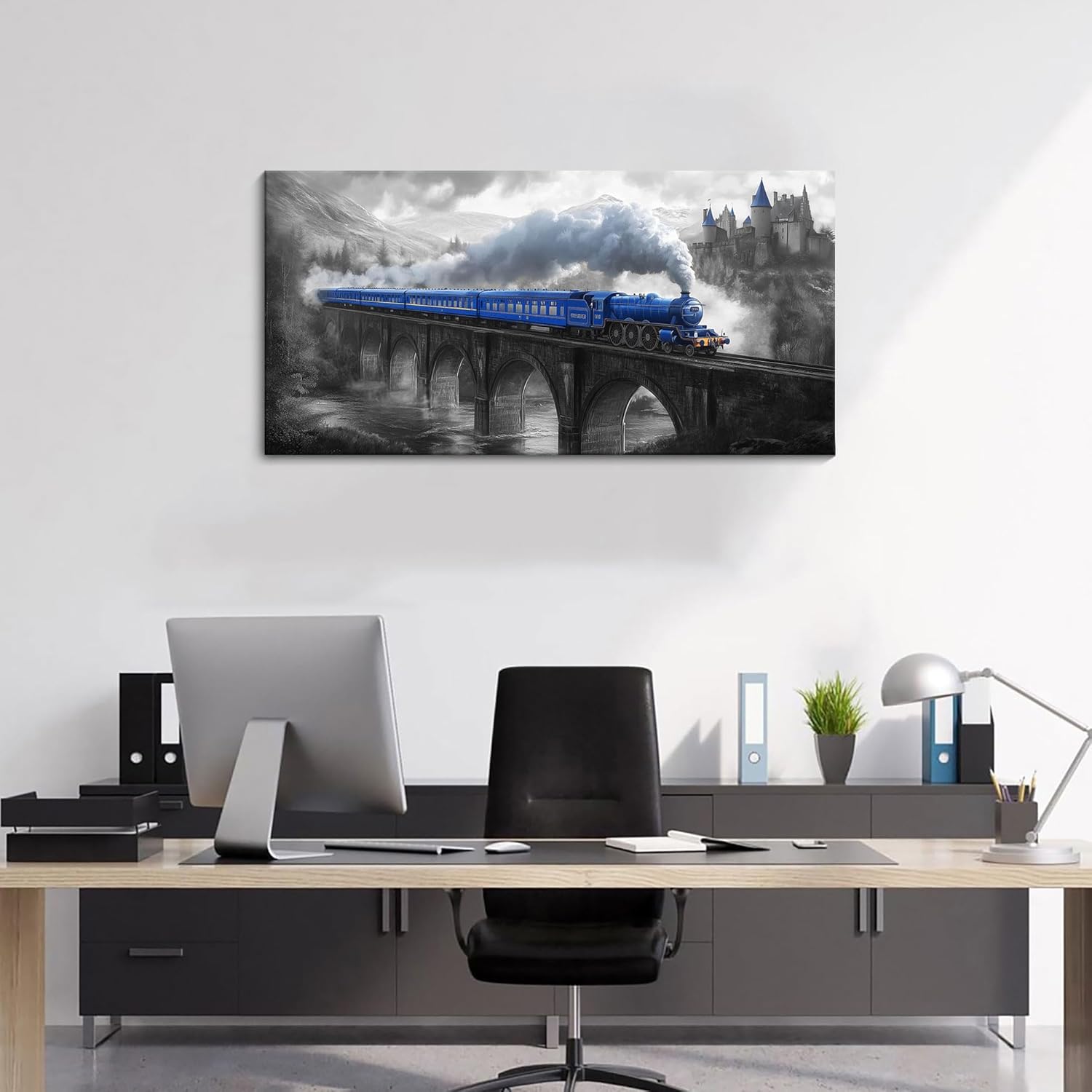 JEAWA Canvas Prints Wall Art – Blue Gray Canvas Painting, Train Artwork Print for Bedroom Bathroom Dining Room Home Office Decor, Great Bridge and Castle Picture, 20 x 40 In
