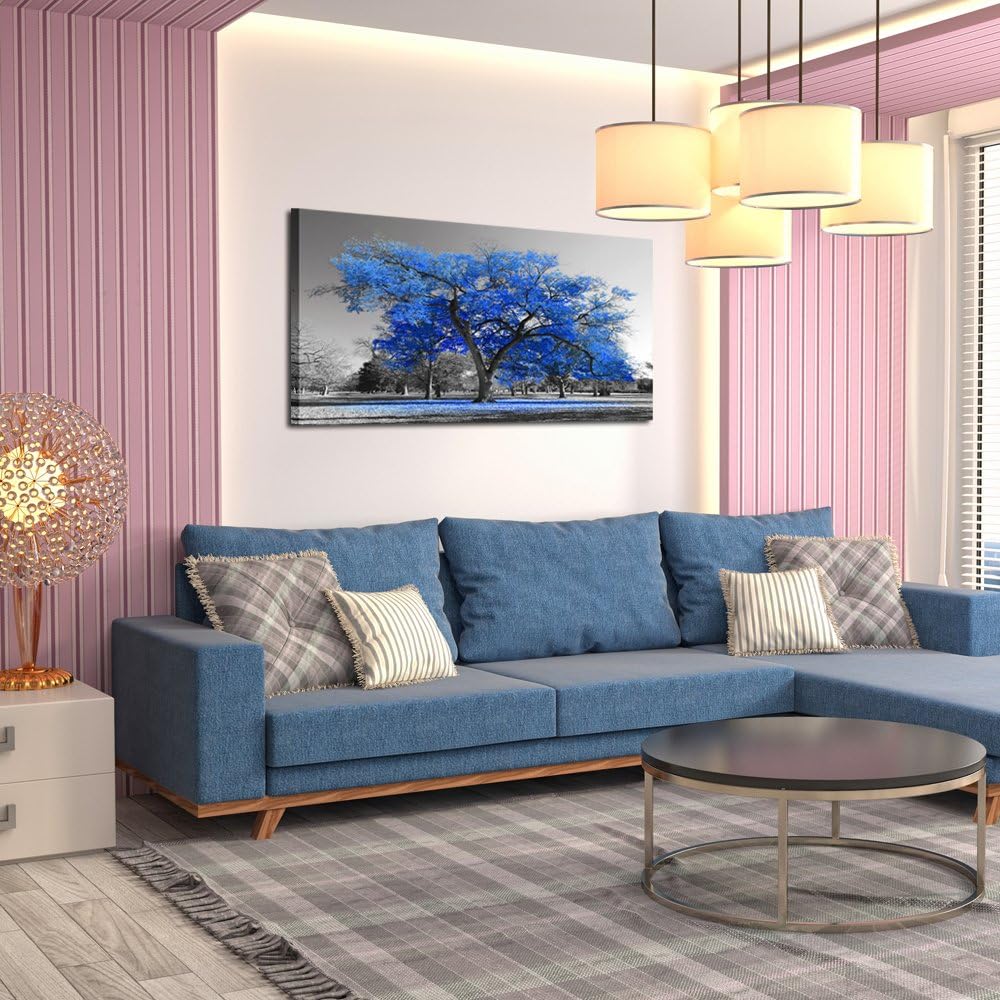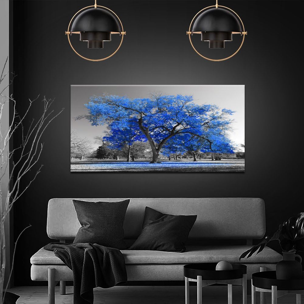 KREATIVE ARTS Canvas Prints Blue Tree Wall Art Painting Contemporary Black and White Fall Landscape Pictures Modern Giclee Stretched and Framed Artwork for Walls 20x40inch