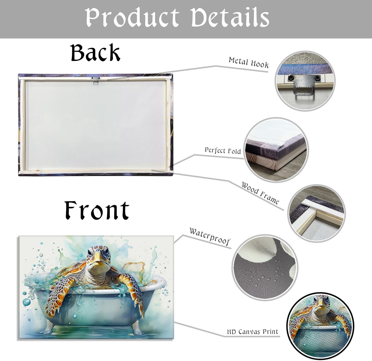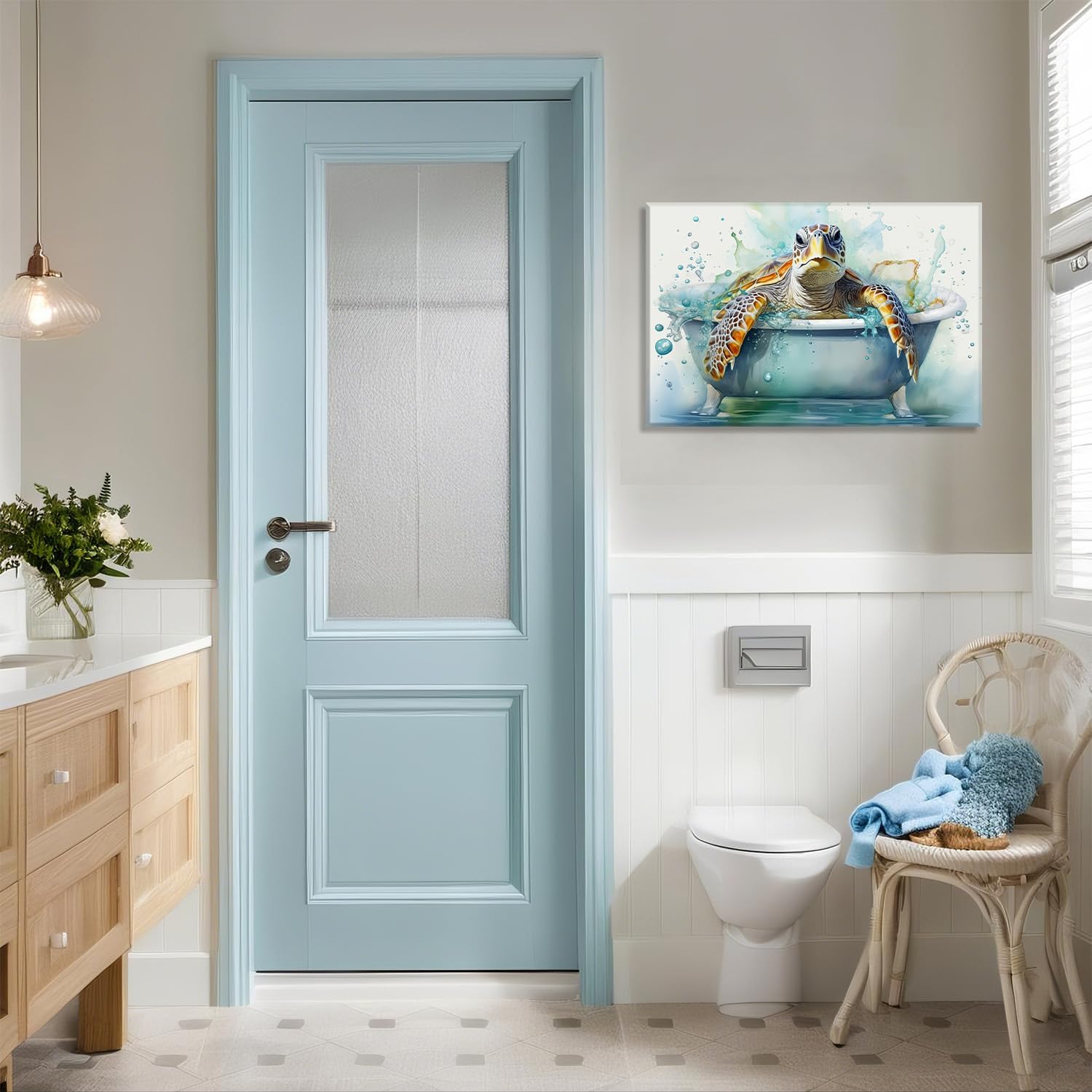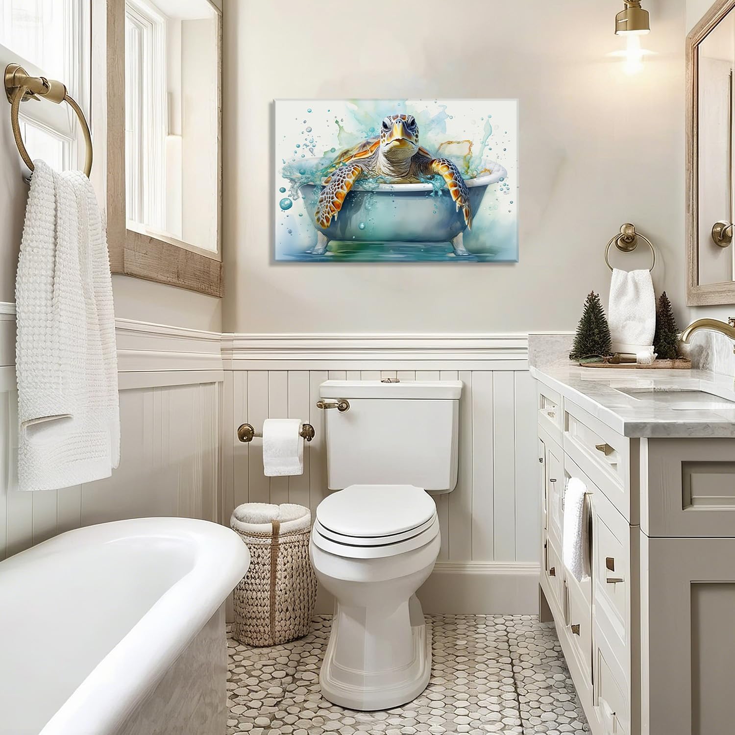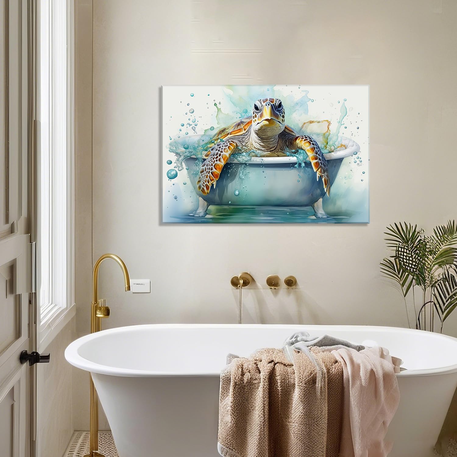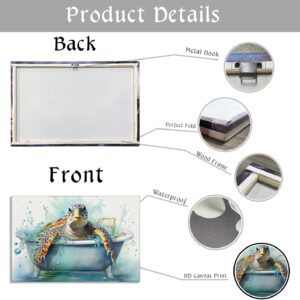 Sea Turtle Canvas Wall Art Bathroom Decor Funny Turtle in Bathtub Picture Sea Creature Prints Ocean Theme Painting Modern Artwork Home Decor Framed – 16.00×24.00 inch