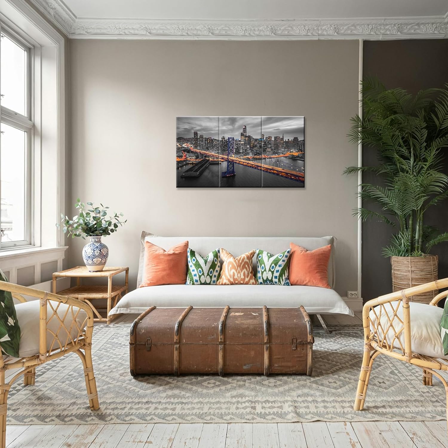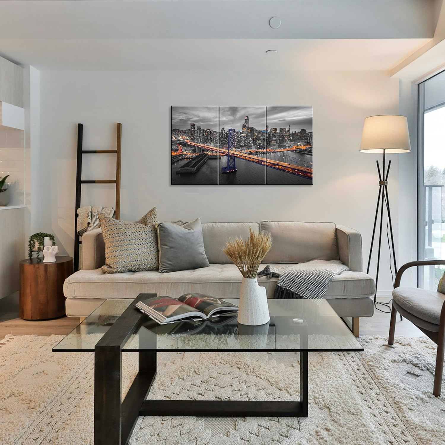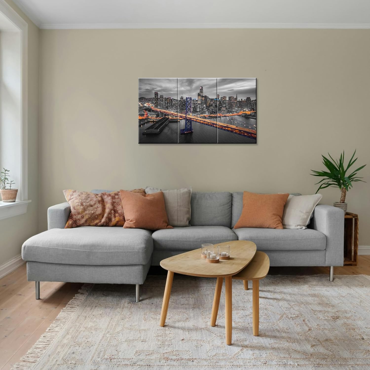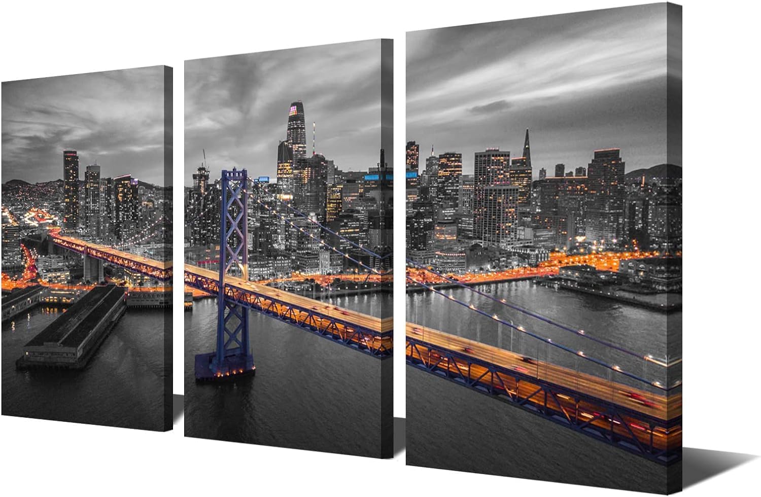 US San Francisco Skyline Wall Art Bay Bridge Wall Decor Black and White Painting Canva Print California Scenery Picture Poster Frame Ready to Hang for Room Bedroom Decoration(54x30inch)